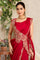 Make a show-stopping entrance in this stunning scarlet red saree gown, a modern twist on a timeless classic. This pre-draped outfit combines the elegance of a saree with the ease of a gown, featuring a beautifully cinched waist and a long, flowing pallu. The outfit is adorned with intricate gold zari and sequin embroidery along the neckline, waist, and borders of the pallu, creating a rich and luxurious look. Perfect for cocktail parties, weddings, and formal events, this saree gown offers a perfect blend of tradition and contemporary style.