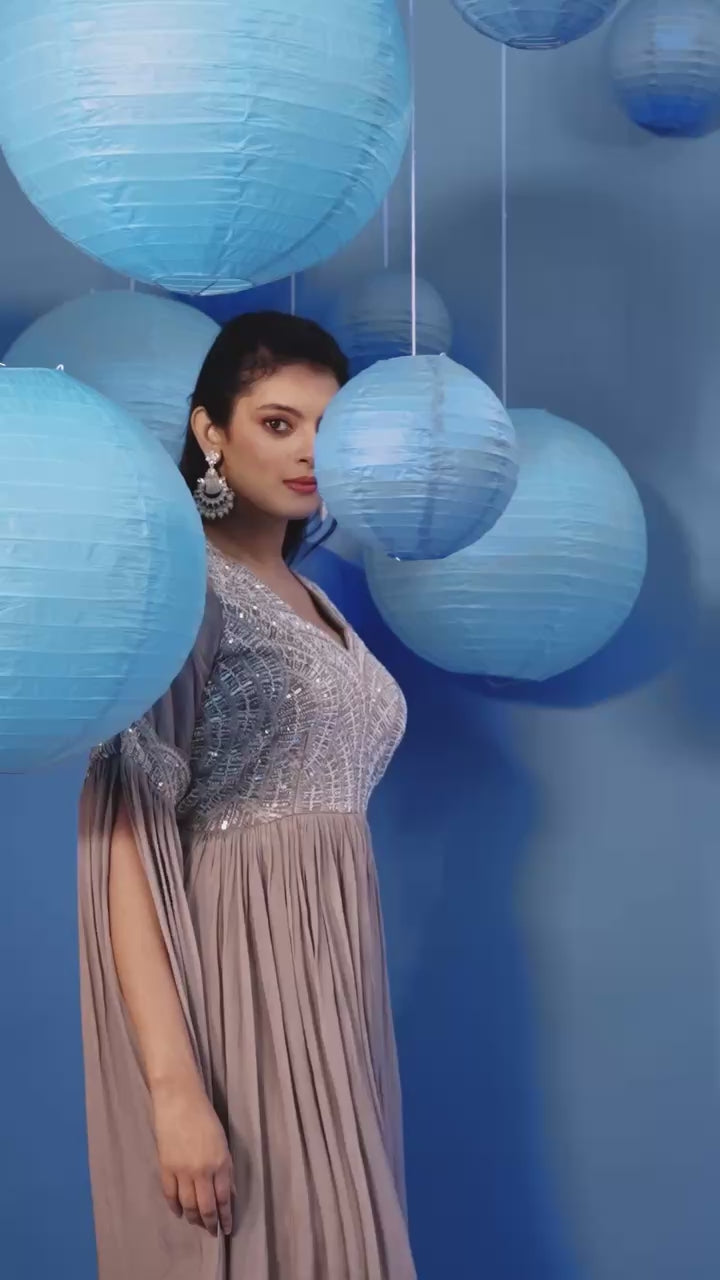 The gown in the image is made with pure georgette and stunning pink piece with hand work on the upper part. It features a flowing, pleated design that extends gracefully to the floor, creating an elegant and sophisticated look. The overall aesthetic is enhanced by the lighted backdrop with circular patterns, adding a touch of glamour to the presentation.